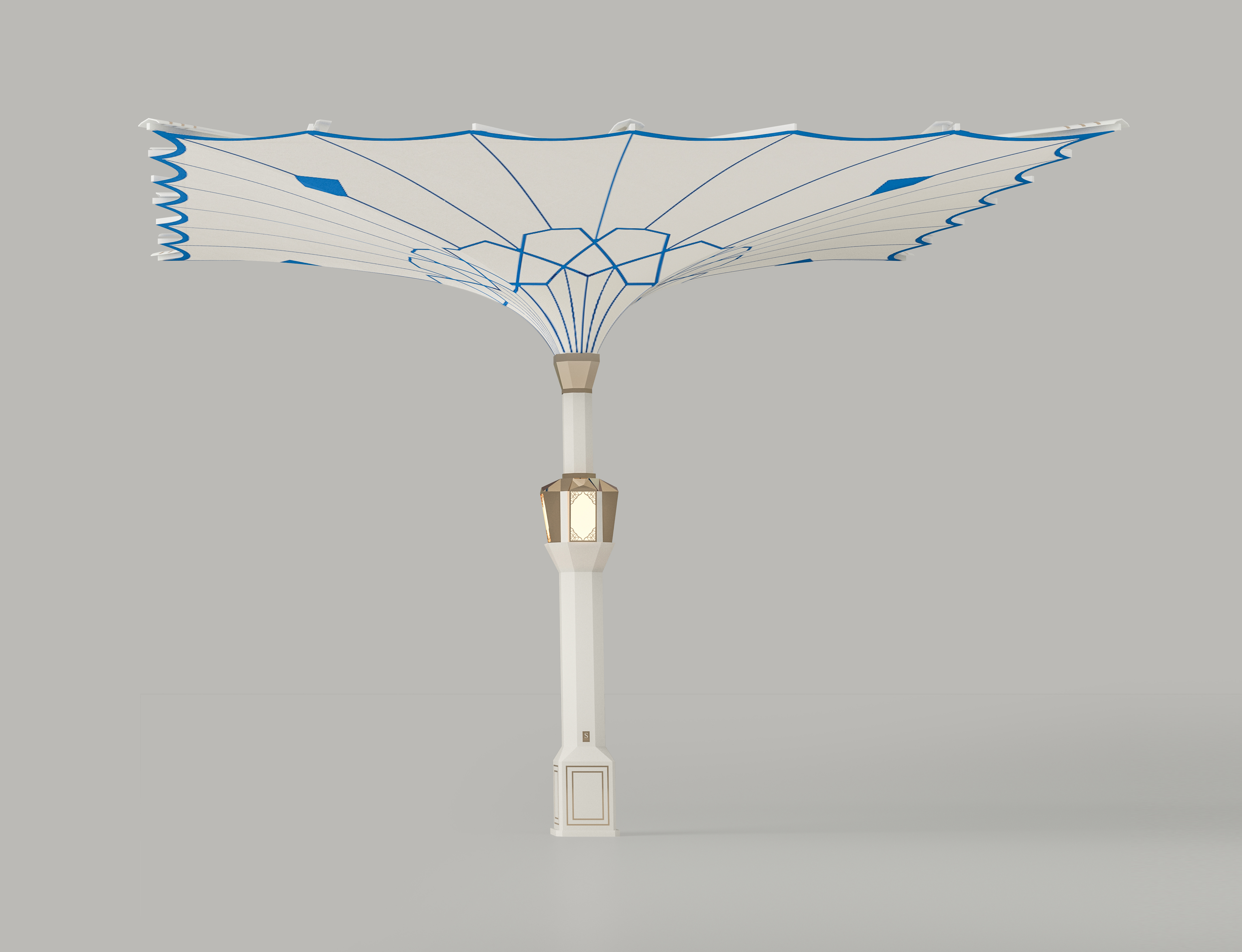Pure PTFE-T special designed, patented Fabric (30 years lifecycle) with Blue Pure PTFE-T Ribbons (ornaments). All coloured yarn have outperforming colour fastness. Pure PTFE-T, which is high - tensile, permanently UV-Resistant, water-proof, dirt-repellent and weather-proof. 80% UV reflection.